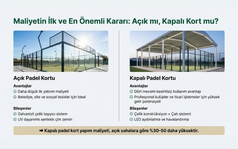 Bütçe odaklı projeler için açık saha; profesyonel tesisler için kapalı veya panoramik kortlar önerilir.