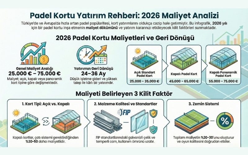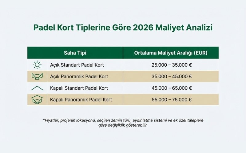 Kapalı ve panoramik padel kortlar için: 45.000 – 75.000 EUR aralığındadır.
