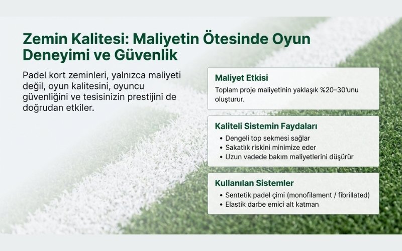 Zemin kalemi, toplam padel kort maliyetinin yaklaşık %20–30’unu oluşturur.
