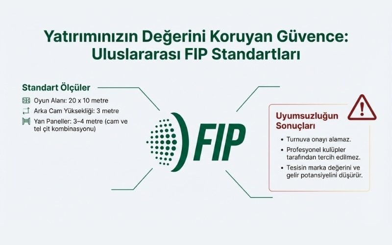 Profesyonel padel kort yapımında FIP (International Padel Federation) standartlarına uyum zorunludur.